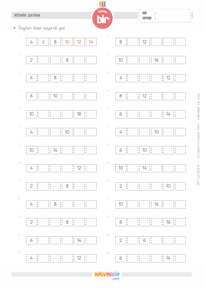1.Sınıf İkişer Ritmik Sayma (20'ye kadar)
