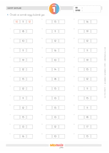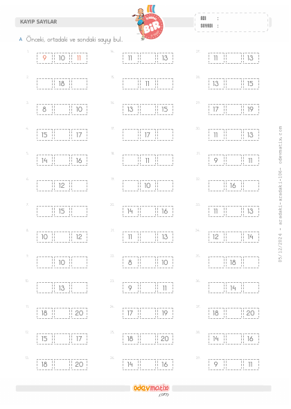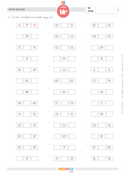 1.Sınıf Önceki ve Sonraki Sayıyı Bulma