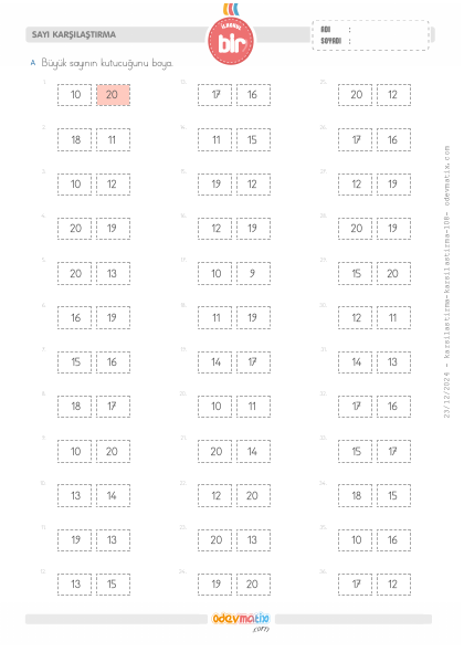 1.Sınıf Sayı Karşılaştırma (20'ye Kadar)