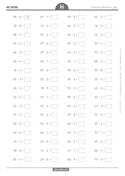 2.Sınıf 2 Basamaklı ile 1 Basamaklı Onluk Bozmasız Yan Yana Çıkarma İşlemi